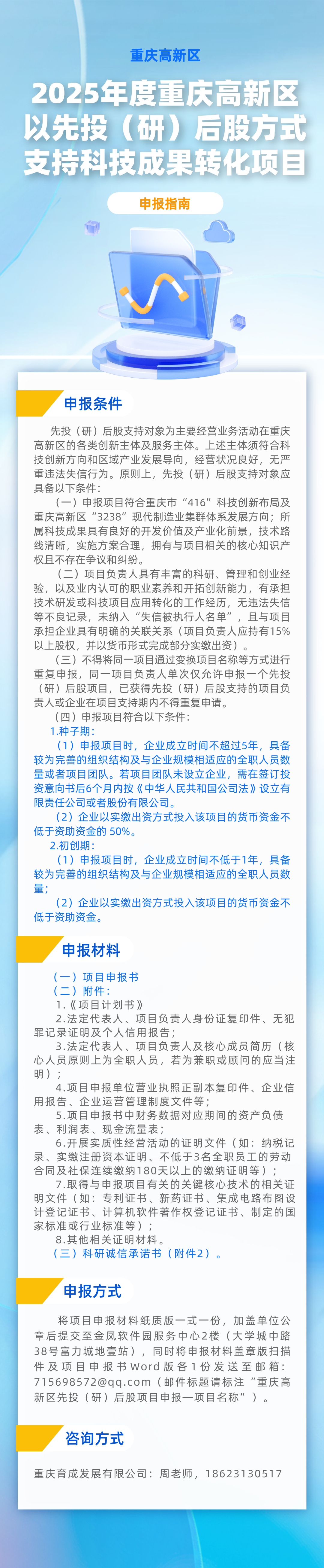 申報(bào)指南 | 重慶育成發(fā)展有限公司關(guān)于申報(bào)2025年度重慶高新區(qū)以先投(研)后股方式支持科技成果轉(zhuǎn)化項(xiàng)目的通知